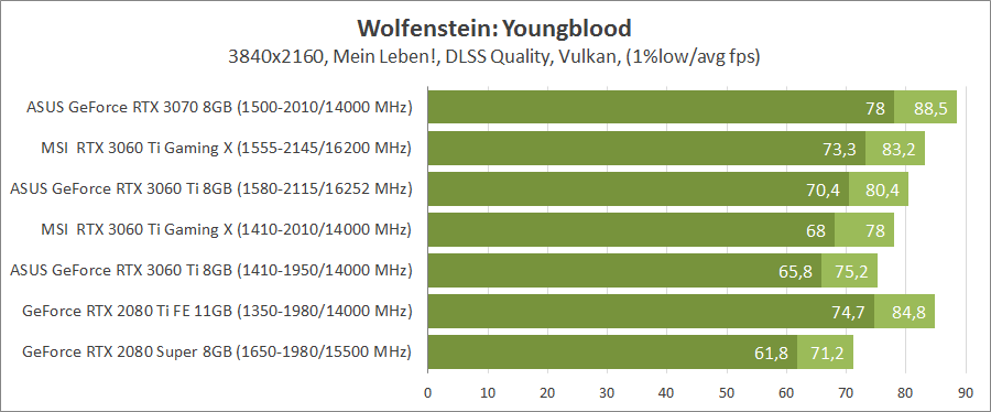 MSI GeForce RTX 3060 Ti на 3% быстрее ASUS GeForce RTX 3060 Ti в меньшем разрешении, в 4K они равны. В разгоне MSI тоже быстрее напарника. Повышение частот минимизирует отставание от GeForce RTX 3070.