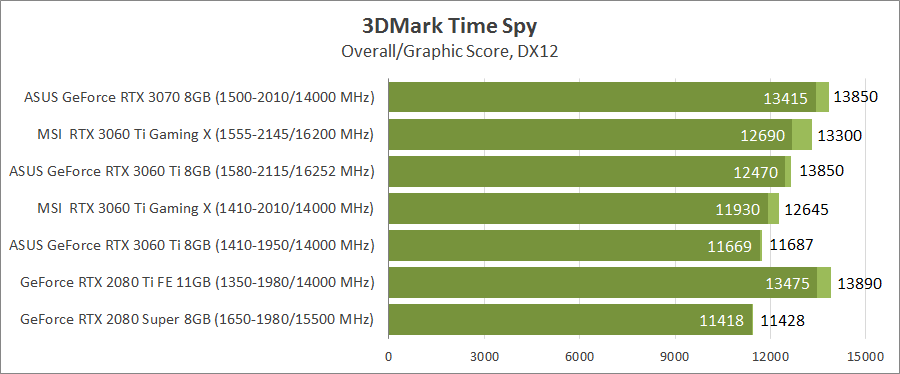 MSI GeForce RTX 3060 Ti стабильно превосходит ASUS в номинале и в разгоне. После повышения частот MSI почти не уступает GeForce RTX 2080 Ti.