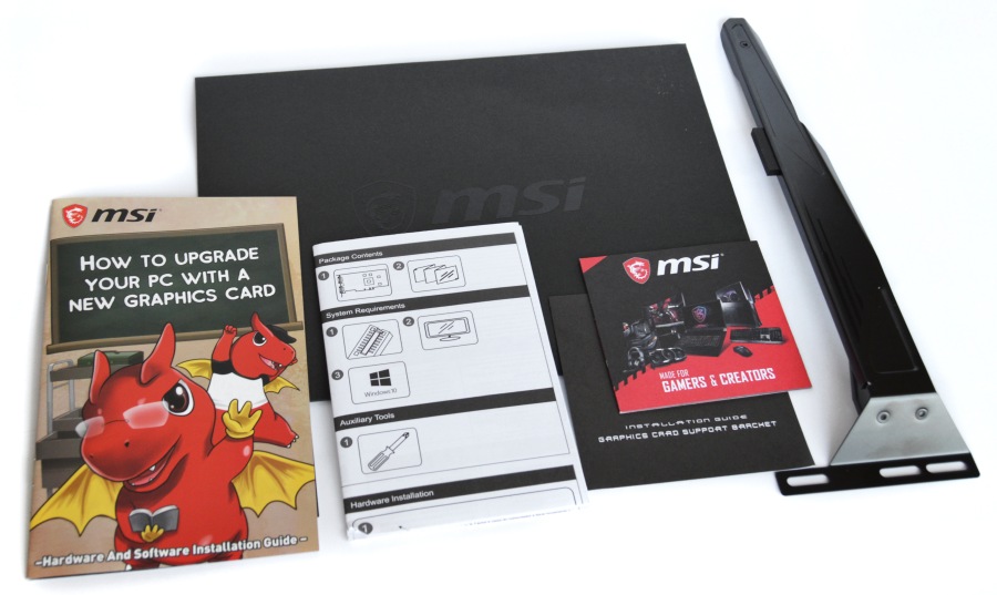 В комплекте есть инструкция и много дополнительной полиграфии. Присутствует специальная подпорка для видеокарты.
