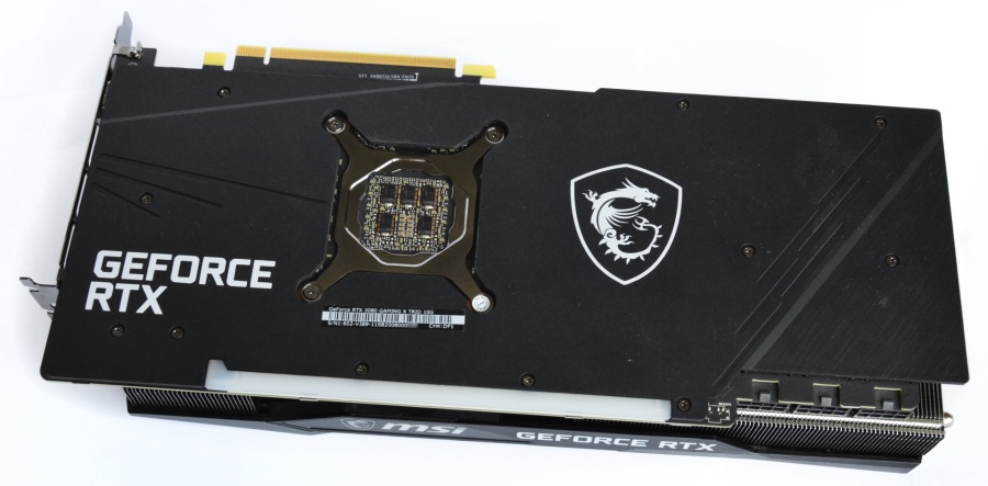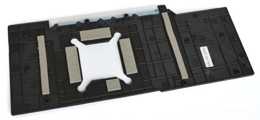 Теперь разберем видеокарту и взглянем на систему охлаждения. Первый сюрприз ожидает при снятии бэкплейта. Это не металлическая пластина, но она явно задействована как радиатор, что видно по большому числу термопрокладок в горячих зонах платы.