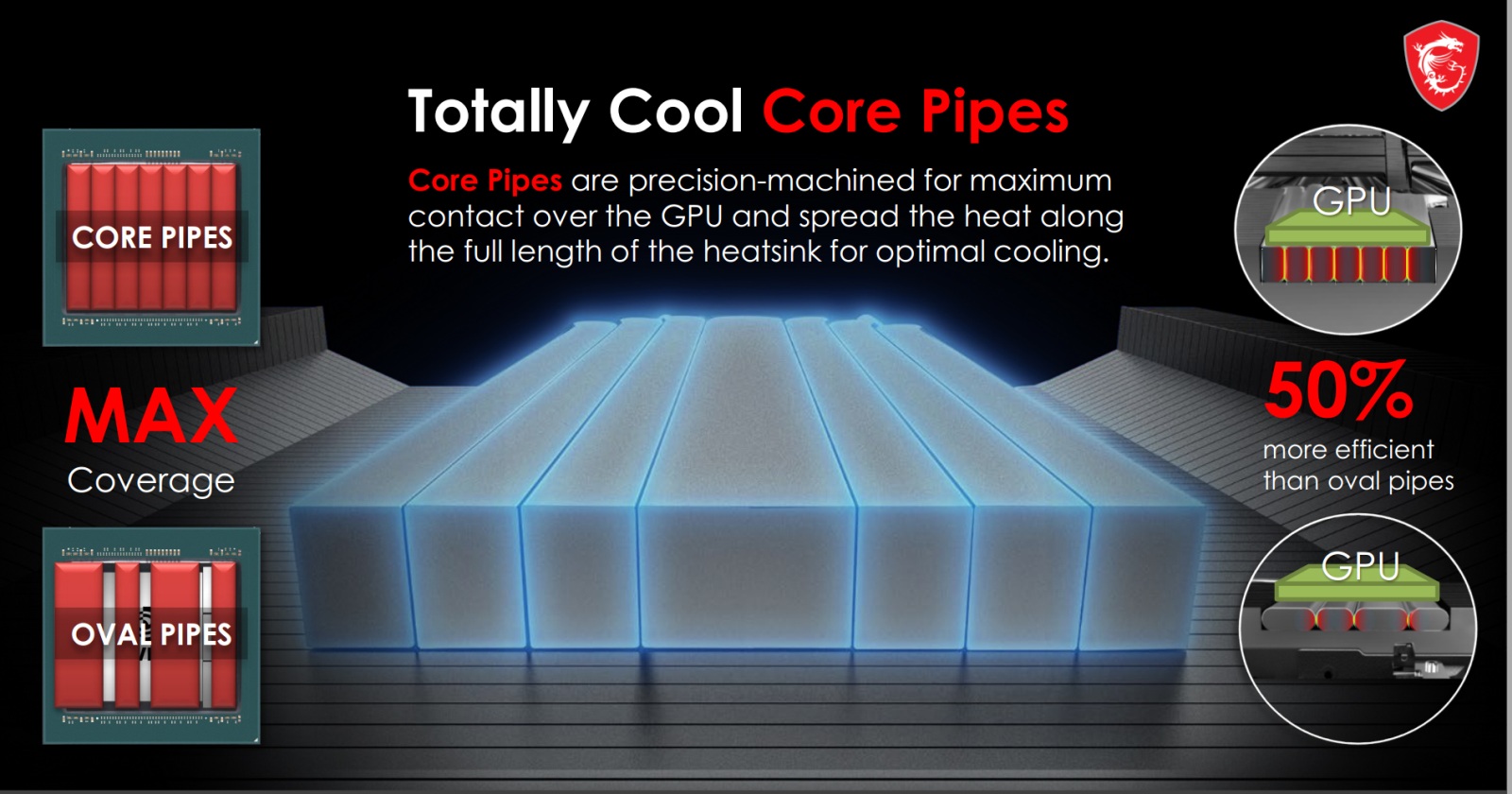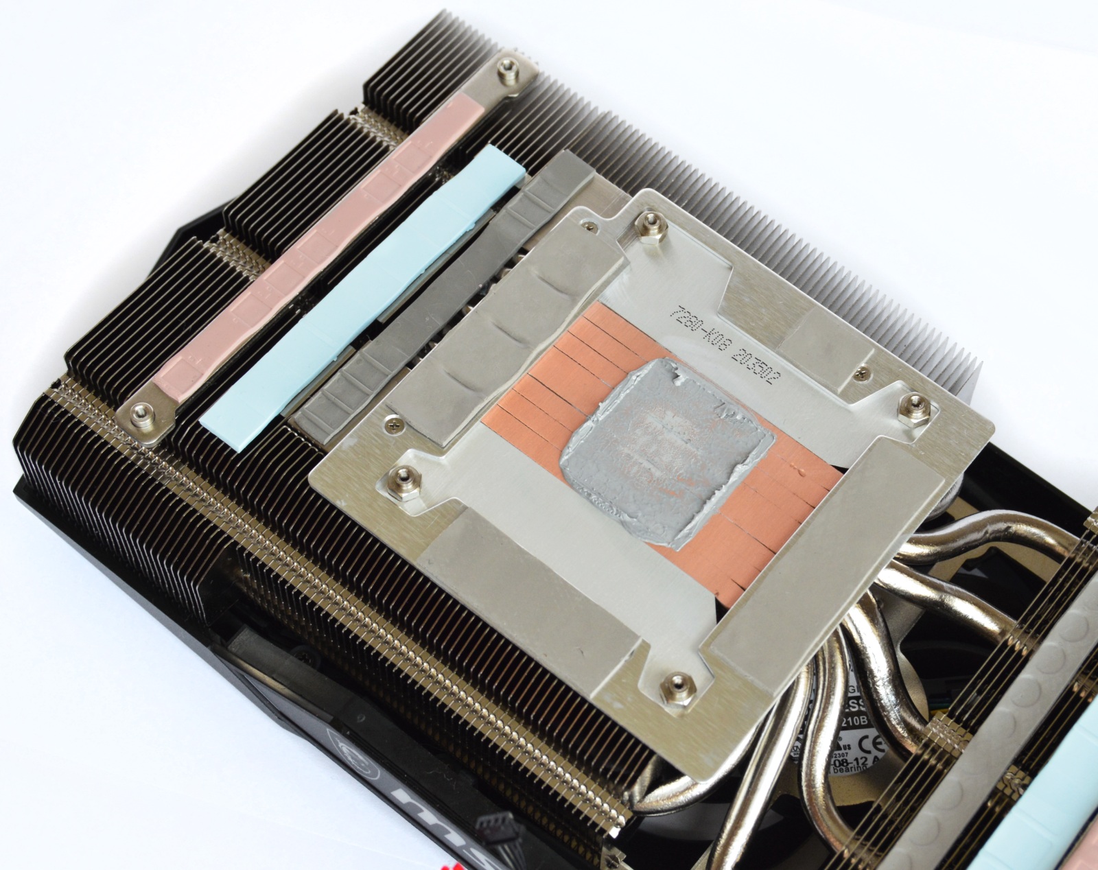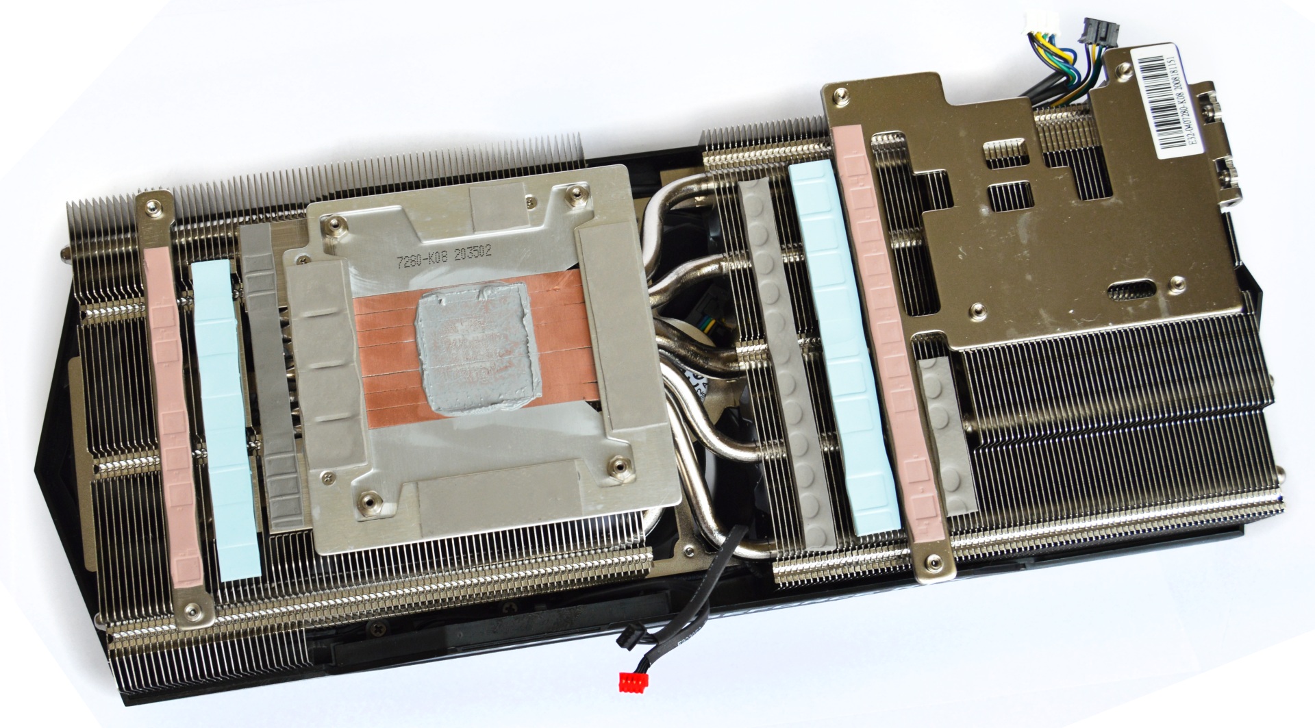 Реализован прямой контакт тепловых трубок с поверхностью графического чипа. Всего трубок семь (в центре самая толстая), и они полностью перекрывают поверхность кристалла.