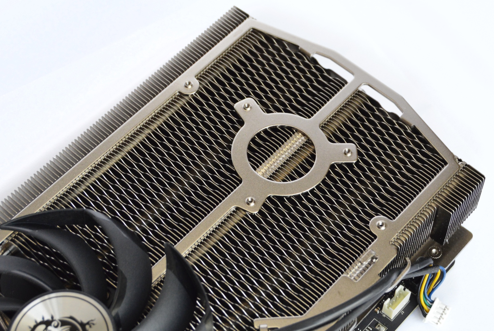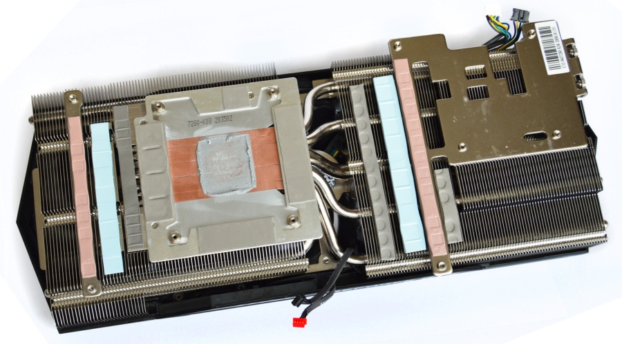 Под кожухом скрывается массивный радиатор с тепловыми трубками и плотным расположением пластин. В основании предусмотрены контактные площадки для всех горячих элементов. Кулер охлаждает GPU, микросхемы памяти и элементы питающих цепей.