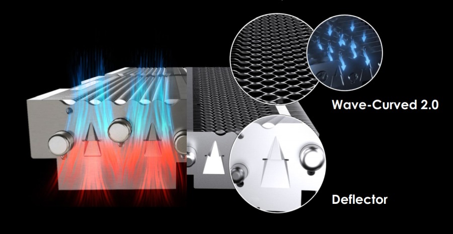 Радиатор имеет конструктивные оптимизации для воздушного потока, чтобы улучшить продуваемость пластин при плотном их расположении.