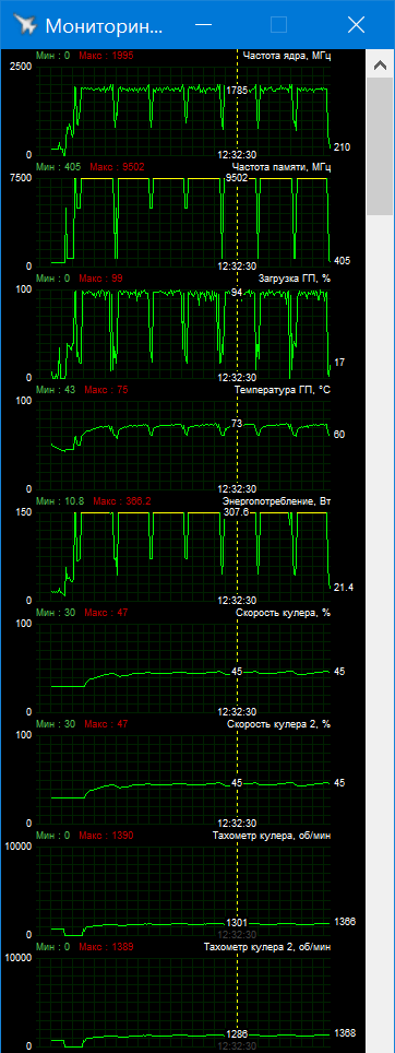 Температура GPU не превышала 75 °C при скорости вентиляторов до 1400 об/мин. Это великолепный результат для столь горячего процессора.