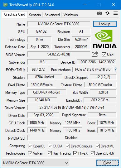 Обычно мы пытаемся оценить не только производительность ускоренных версий, но и рядовых моделей, немного снижая частоты. В данном случае не был известен точный частотный режим Founders Edition. Но согласно первым обзорам референсные видеокарты GeForce RTX 3080 тоже демонстрируют частоты выше заявленного Boost Clock, и работают где-то в диапазоне 1800–1900 МГц, что примерно на 100 МГц ниже MSI Gaming X.