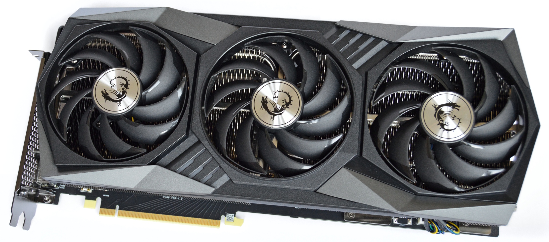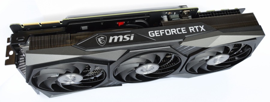 Полная длина видеокарты составляет 32,5 см. Кулер занимает три слота расширения и охлаждается тремя вентиляторами. Визуально данная модель идентична MSI GeForce RTX 3080 Gaming X Trio 10G.