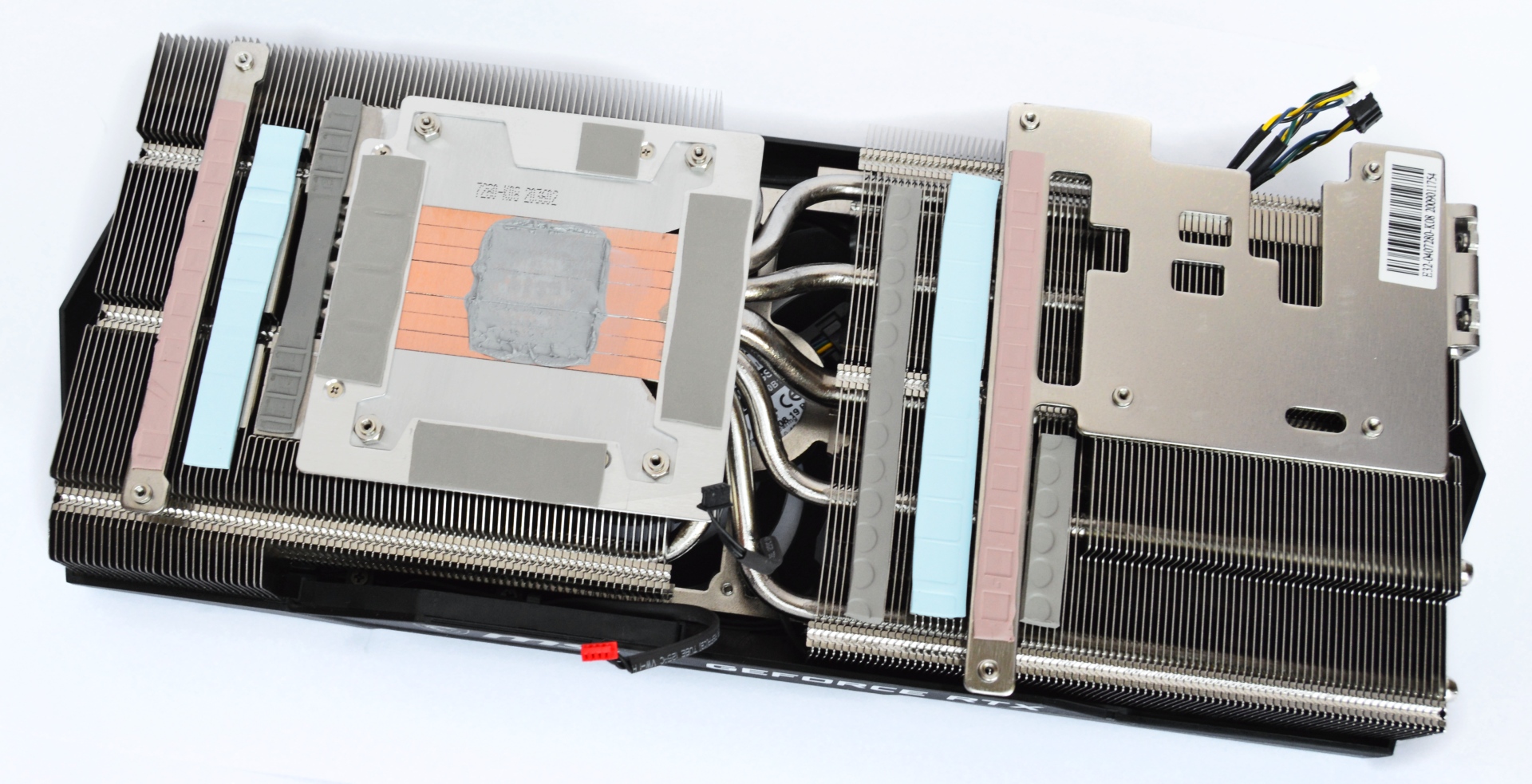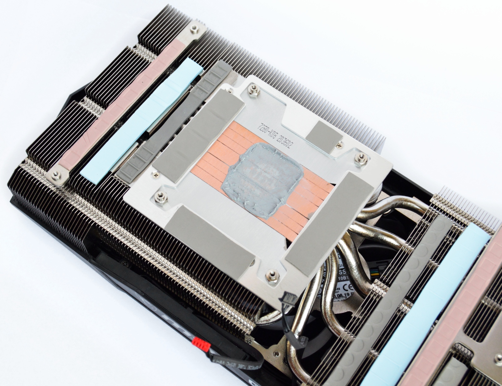 Реализован прямой контакт тепловых трубок с поверхностью графического чипа, и реализован он довольно грамотно — трубки перекрывают всю площадь кристалла GPU и тщательно подогнаны друг к другу во избежание лишних зазоров.