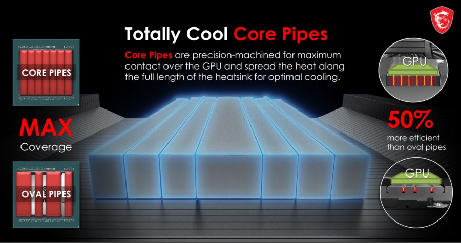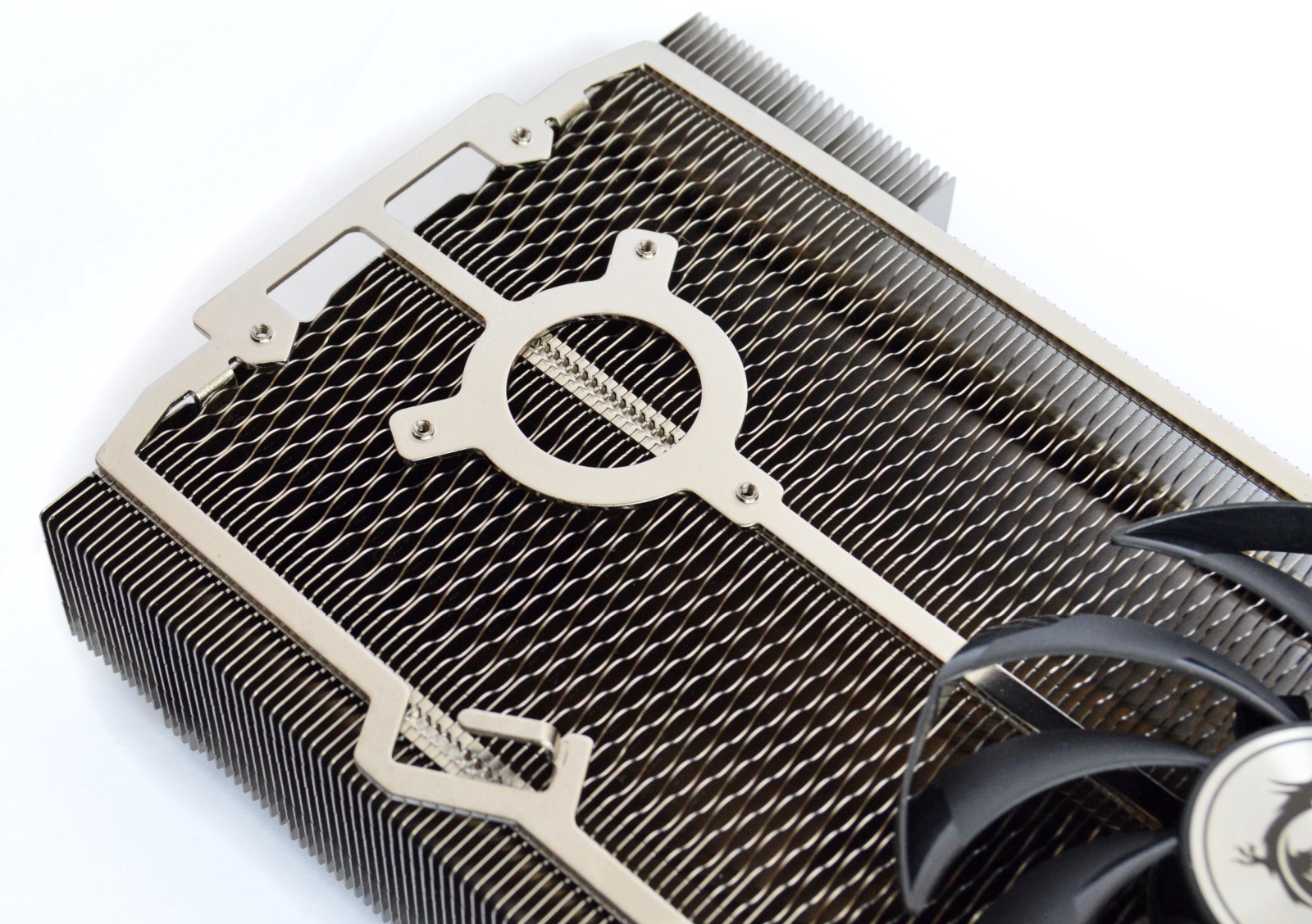 Инженеры MSI постарались не только максимально увеличить площадь рассеивания тепла за счет наращивания объема радиатора, но и оптимизировали его конструкцию для эффективной теплоотдачи при невысокой скорости вентиляторов.