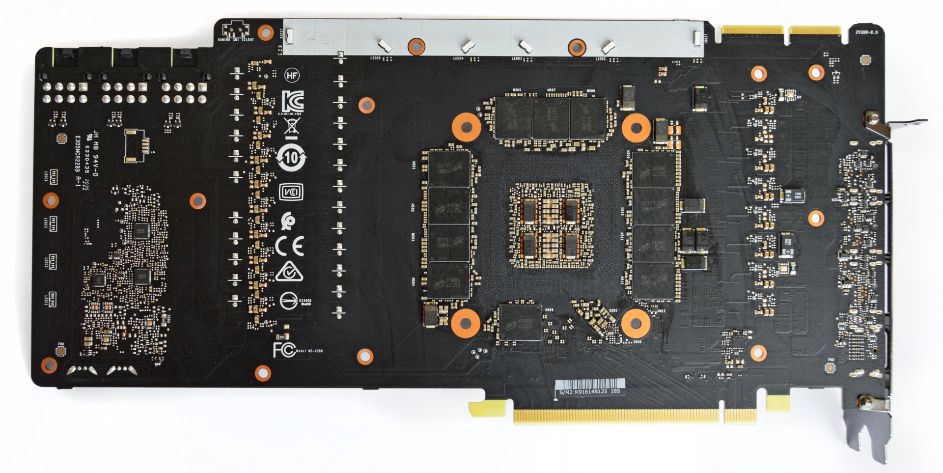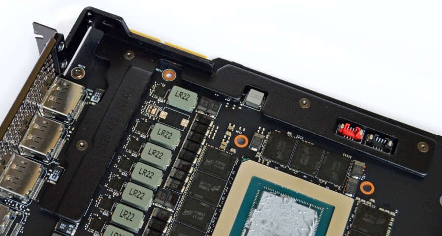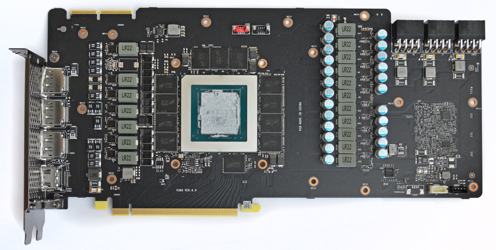 MSI RTX 3090 Gaming и MSI RTX 3080 Gaming используют печатные платы схожего дизайна. У старшей модели больше объем памяти, поэтому микросхемы расположены с обеих сторон текстолита.