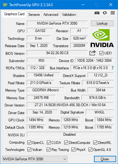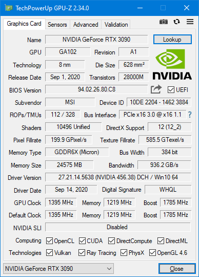 Стандартные спецификации предусматривают для GeForce RTX 3090 базовую частоту ядра 1395 МГц при среднем Boost Clock 1695 МГц. У MSI Gaming X Trio параметр Boost Clock повышен до 1785 МГц. Эффективная частота обмена данными у памяти GDDR6X на уровне 19500 МГц.