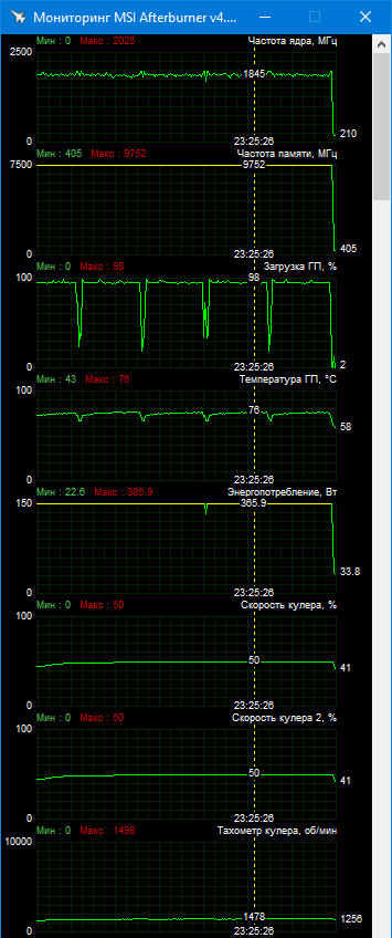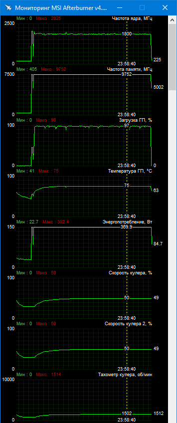 Тестирование проводилось внутри открытого корпуса Antec NX800 при температуре в помещении 24–25 °C. В таких условиях во многих тяжелых играх частоты Boost держались в диапазоне 1800–1950 МГц. Ниже это проиллюстрировано на скриншотах мониторинга во время нагрузки бенчмарка Bright Memory: Infinite RTX и Horizon Zero Dawn в 4K.