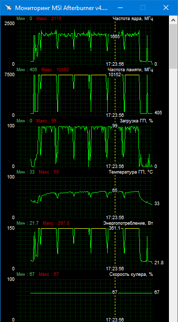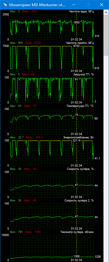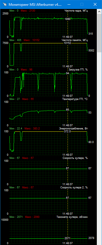 Мы получили небольшой рост частот Boost, во многих играх нижняя планка частот выросла на 50–100 МГц. Для сохранения стабильности (особенно для памяти) скорость вентиляторов пришлось поднять, чтобы обеспечить общее снижение рабочих температур.