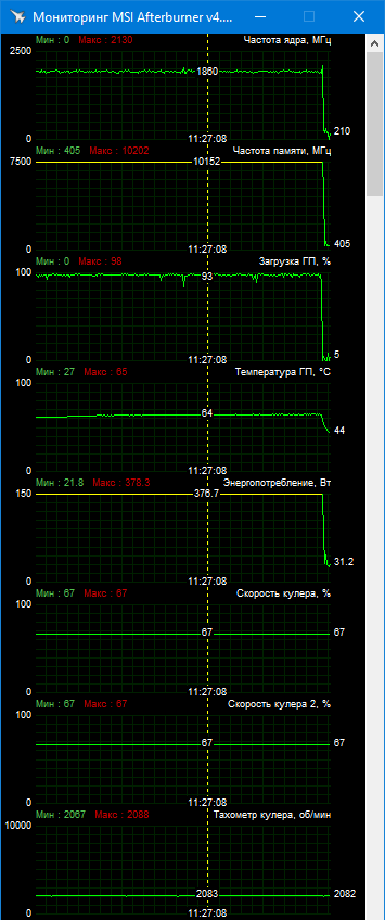 Самый большой разброс частот GPU по-прежнему наблюдался в The Division 2. При пиковых значениях до 2115 МГц были просадки вплоть до 1650 МГц.