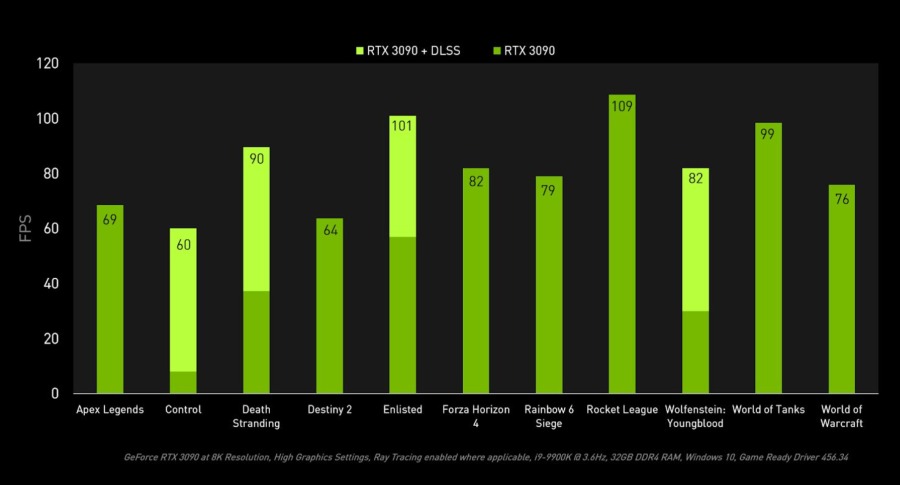 Игры в 8K кажутся фантастикой, но мощный потенциал GPU GA102 и высокий объем памяти в 24 гигабайта делают их реальностью. Речь не идет о том, чтобы играть при максимальных настройках, и в ряде случаев ускорить игры поможет режим DLSS. Но GeForce RTX 3090 способна обеспечить более 60 кадров в Apex Legends, Destiny 2, Death Stranding, Rainbow Six Siege, Forza Horizon 4, World of Tanks и других играх.