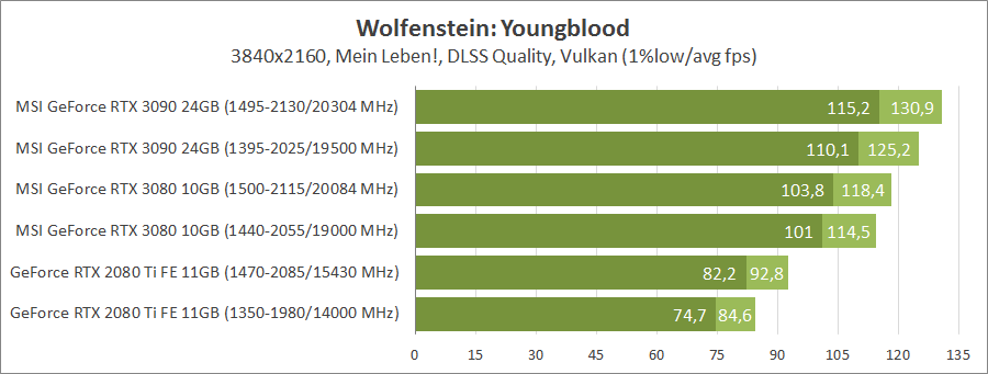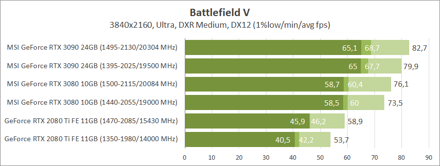 GeForce RTX 3090 привычно выигрывает 10% у GeForce RTX 3080, отрыв от GeForce RTX 2080 Ti достигает 53–55%.