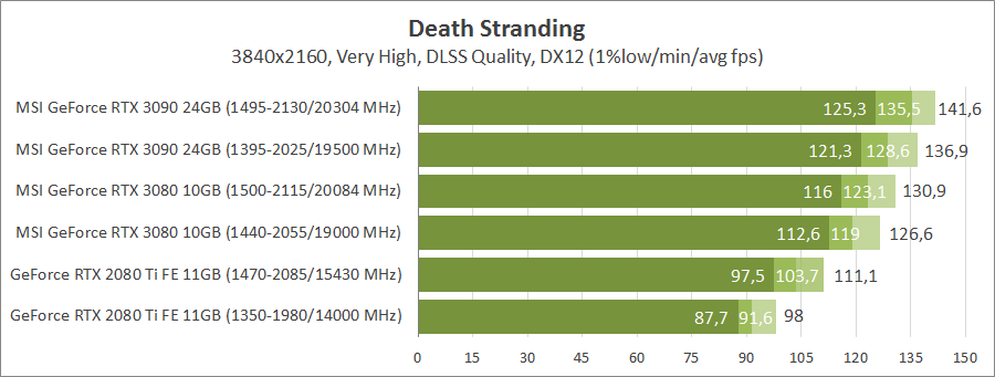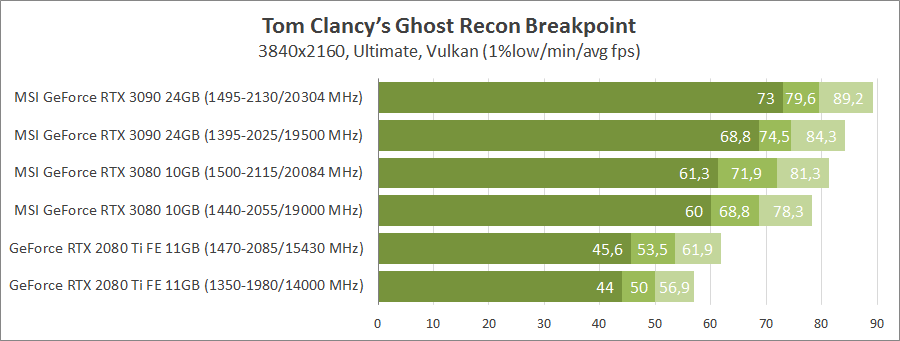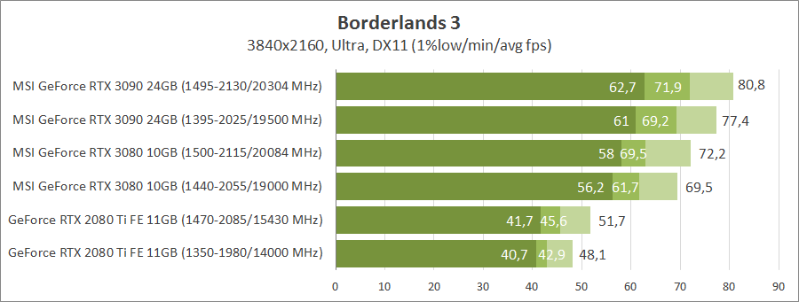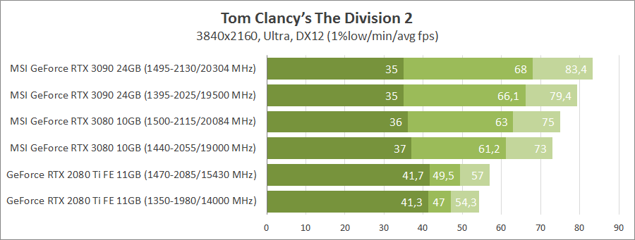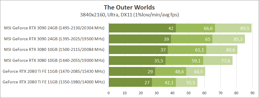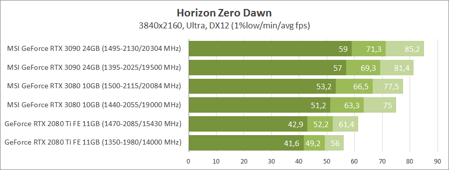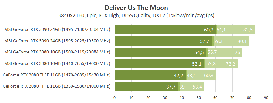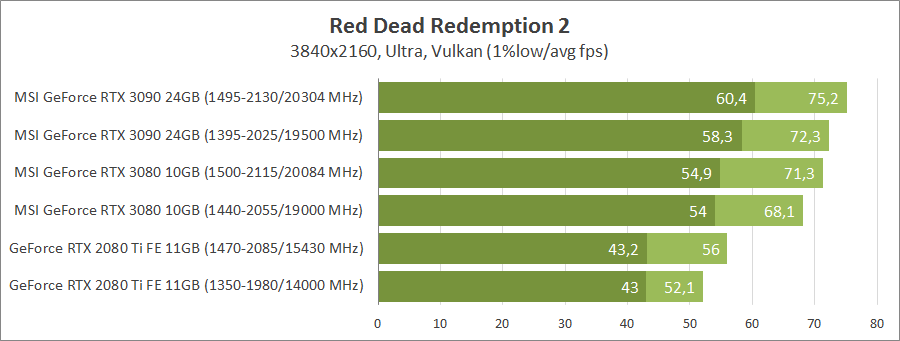 В данной игре разница между GeForce RTX 3090 и GeForce RTX 3080 около 8%, разница со старым флагманом менее 43%.