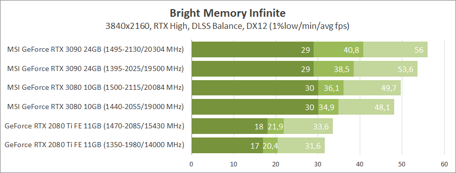 В режиме с DLSS разрыв между GeForce RTX 3090 и GeForce RTX 2080 Ti на уровне 58–60%.