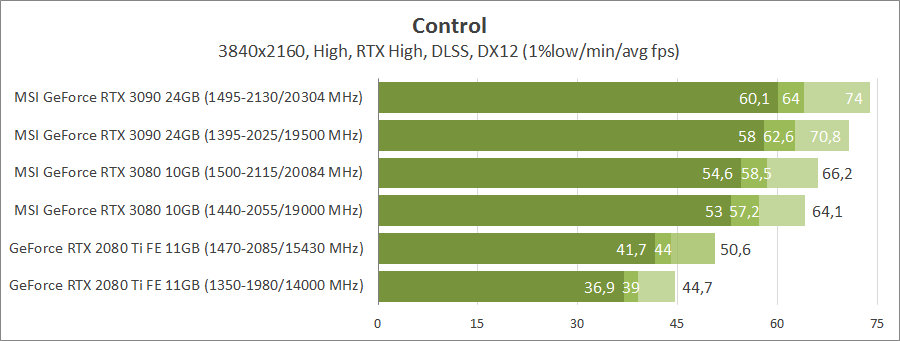 В Control разница между GeForce RTX 3090 и GeForce RTX 3080 около 10%. Отрыв новичка от старого флагмана GeForce RTX 2080 Ti более 55%.