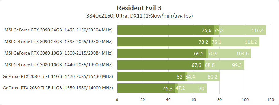 В Resident Evil 3 разница между старшими участниками 10–12%. Разрыв между GeForce RTX 3090 и GeForce RTX 2080 Ti около 60%. Подробнее о производительности других видеокарт в отдельном обзоре.