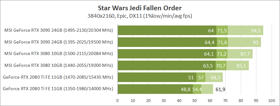 В Fallen Order у старших видеокарт идентичные минимальные показатели, вероятно, система уперлась в потенциал процессора. По средней частоте кадров стандартная ситуация с разницей около 10% между новыми GeForce RTX.