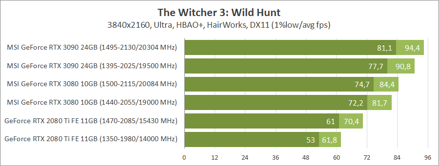 В «Ведьмаке» при максимальных настройках графики производительность приближается к 90–100 кадрам. При сравнении GeForce RTX 3090 и GeForce RTX 2080 Ti в номинальном режиме разница 47%.