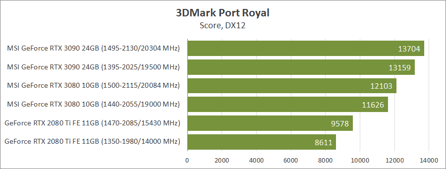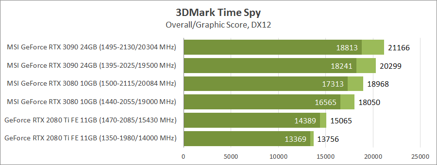 В тестах 3DMark флагман стабильно выигрывает 13% у GeForce RTX 3080, разница с GeForce RTX 2080 Ti около 50%.