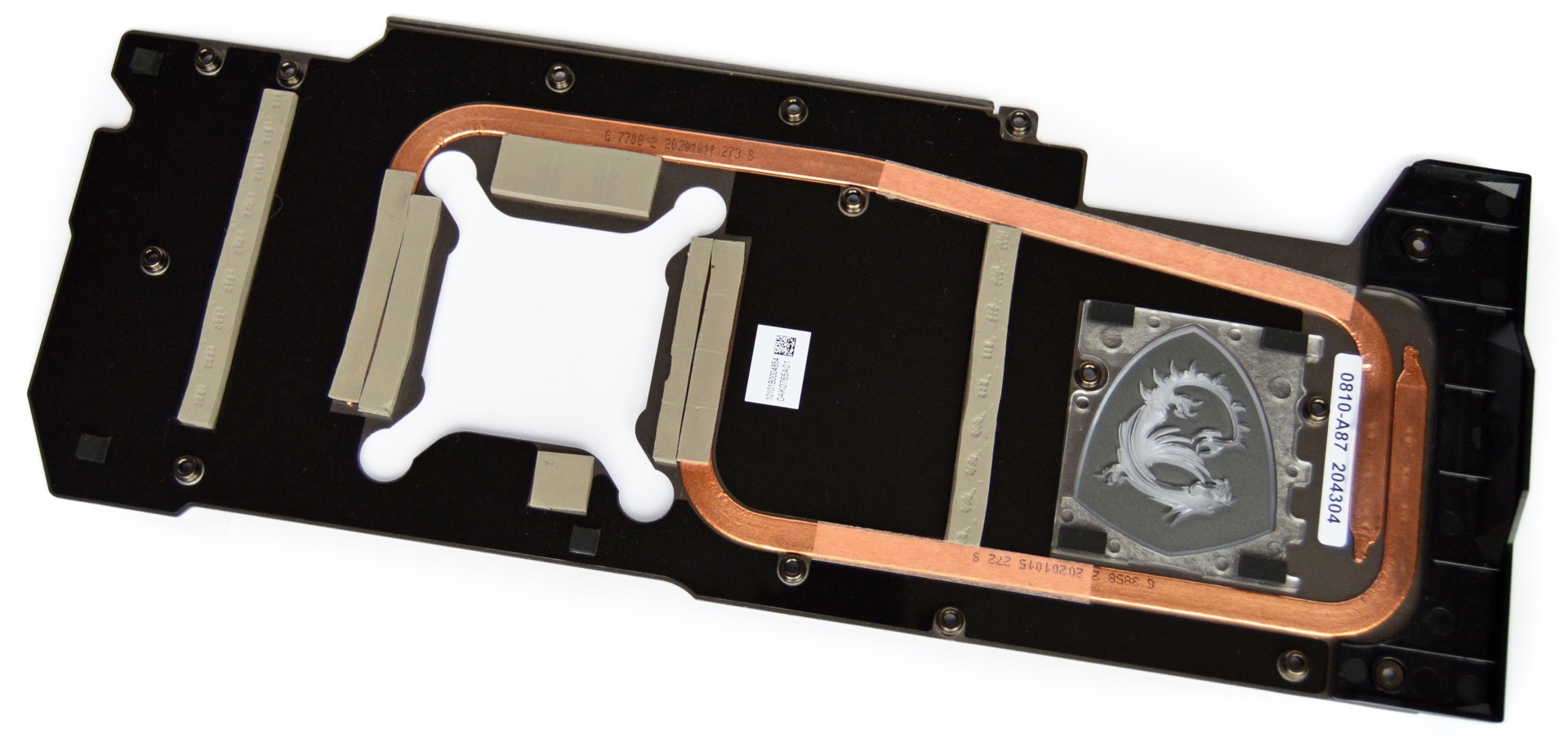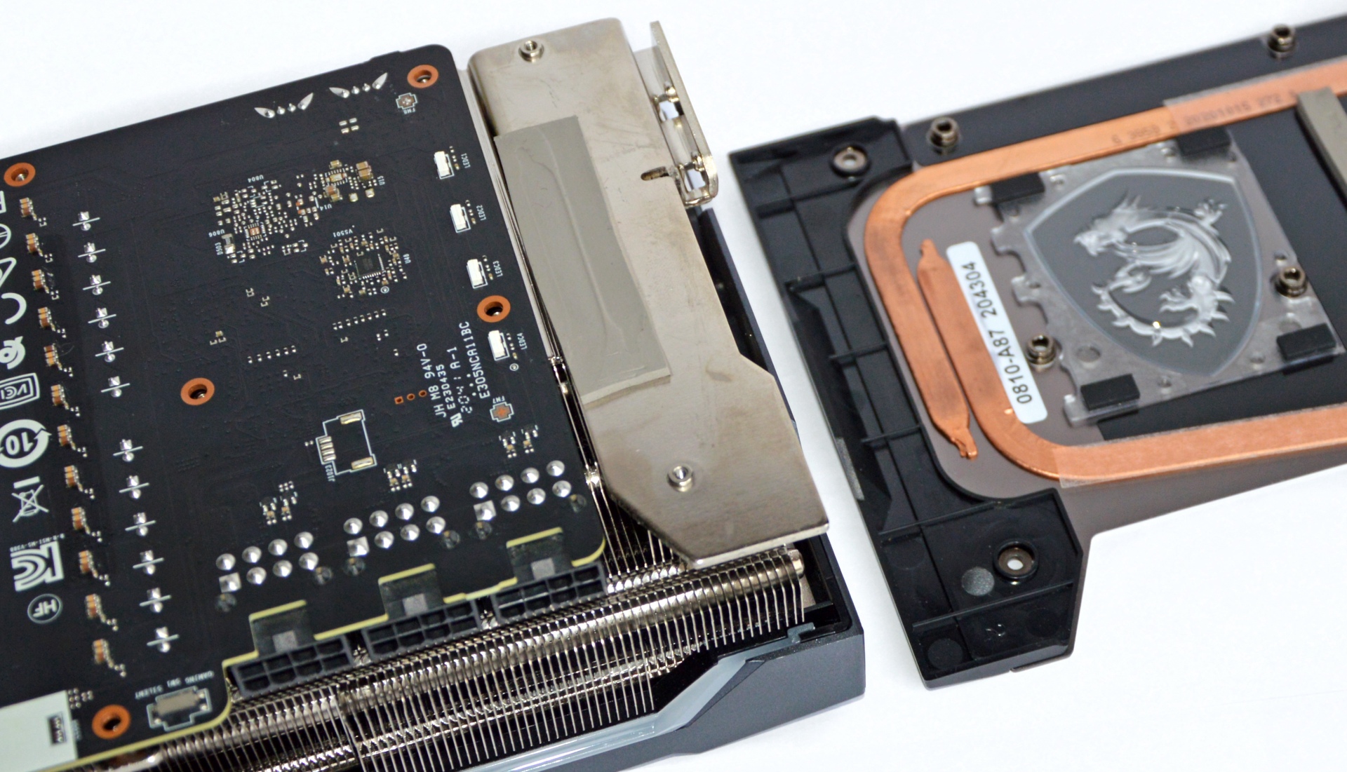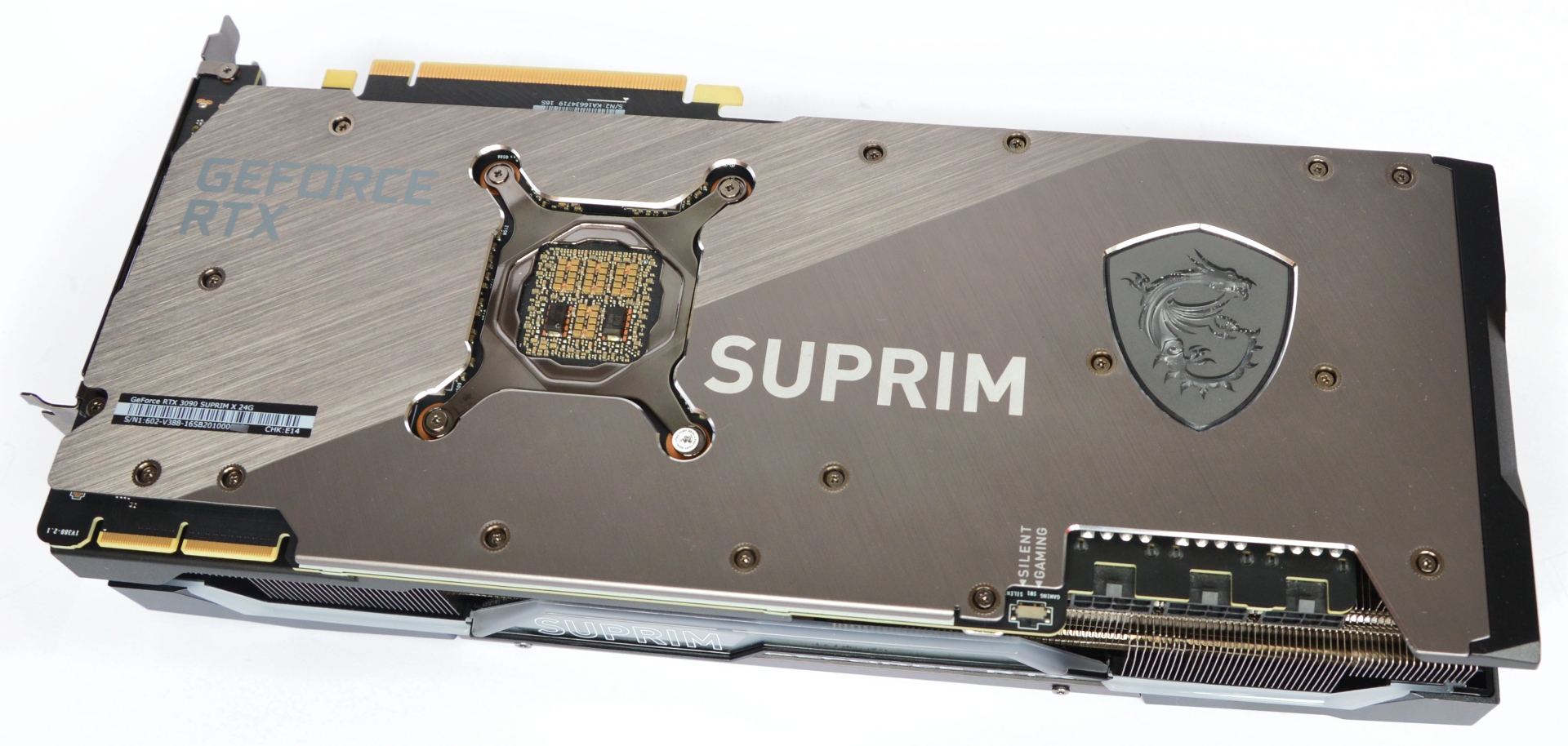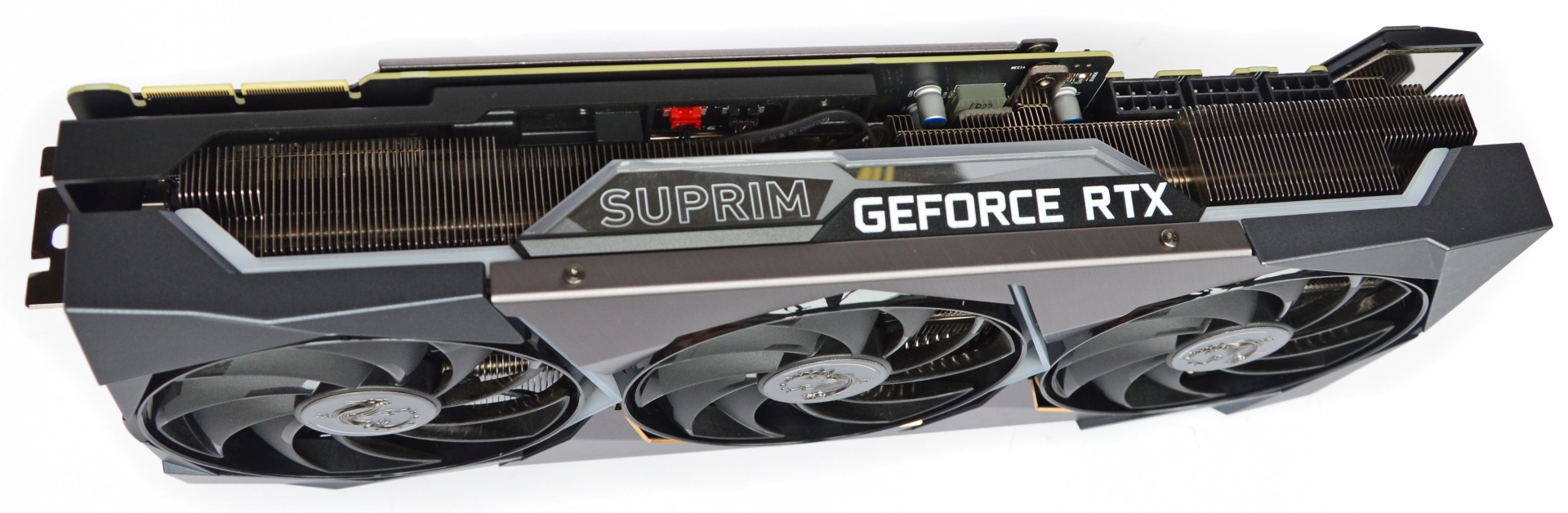 У обеих видеокарт используется металлический бэкплейт с двумя тепловыми трубками, которые отводят тепло от микросхем памяти, но у MSI Suprim эти трубки длиннее.