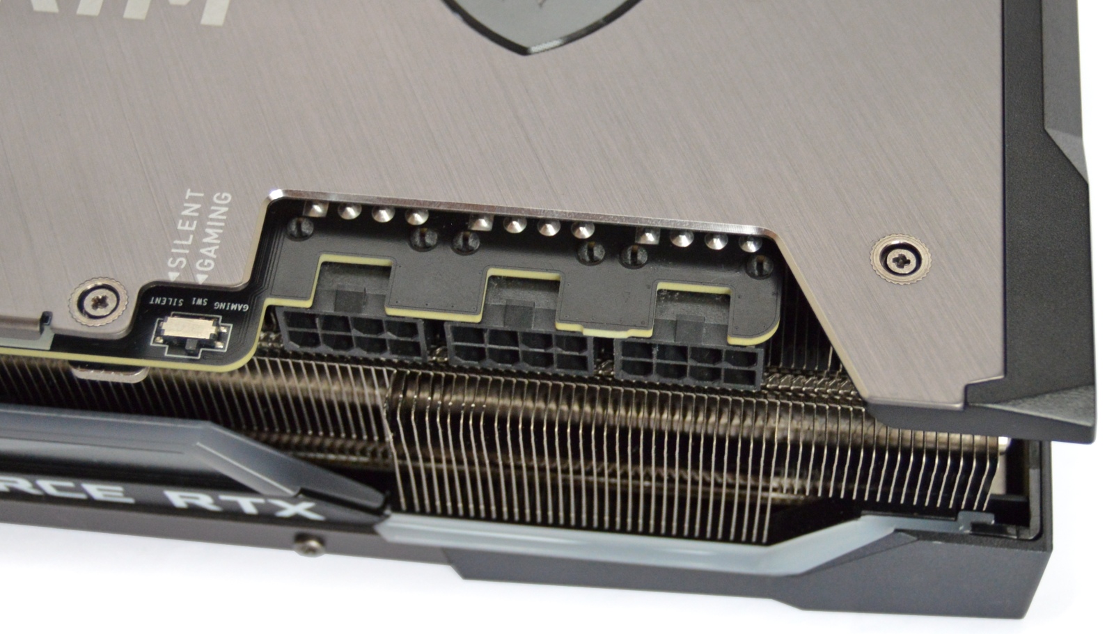 У Suprim три восьмиконтактных разъема питания. Рядом с ними находится переключатель для выбора одного из двух BIOS. Это стандартная прошивка Gaming и более тихий режим Silent.
