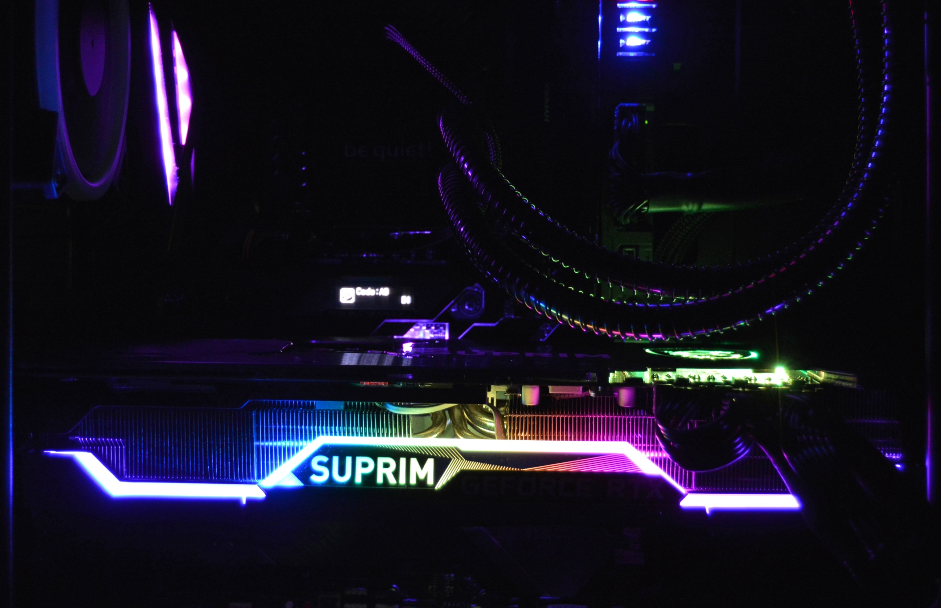 Что касается непосредственно подсветки, то она явно порадует любителей светящихся ПК. У видеокарты есть подсвечиваемые элементы с обеих сторон и большая светящаяся боковая полоса с логотипом Suprim.