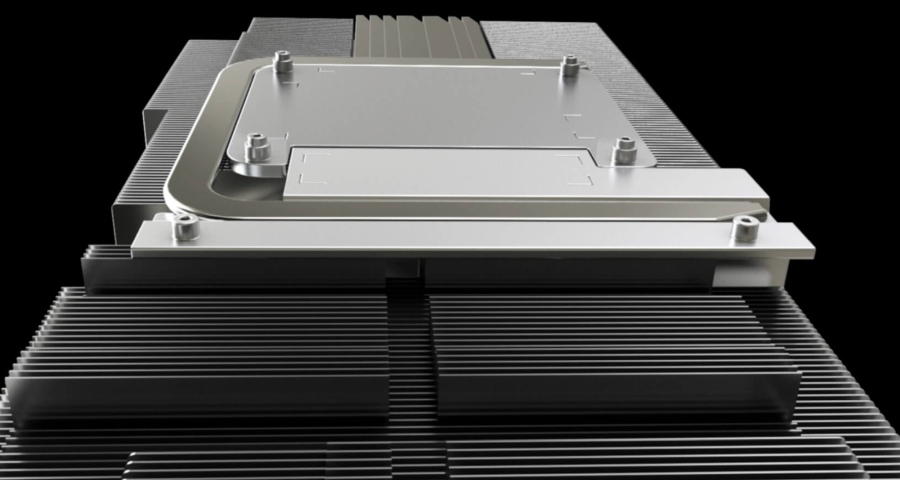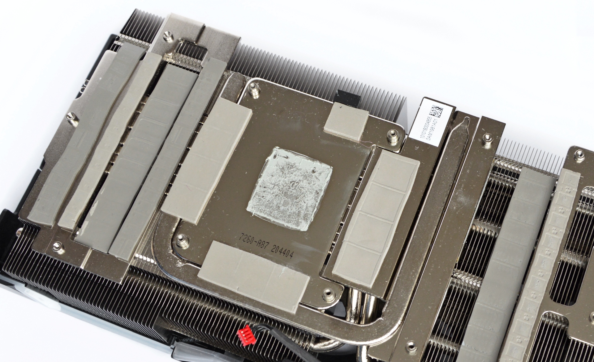 Контакт с GPU осуществляется через массивное ровное основание, вокруг которого тянется сплющенная тепловая трубка, участвующая в отводе тепла от микросхем памяти. У MSI Gaming реализован прямой контакт с тепловыми трубками и нет отдельной тепловой трубки для чипов GDDR6X.