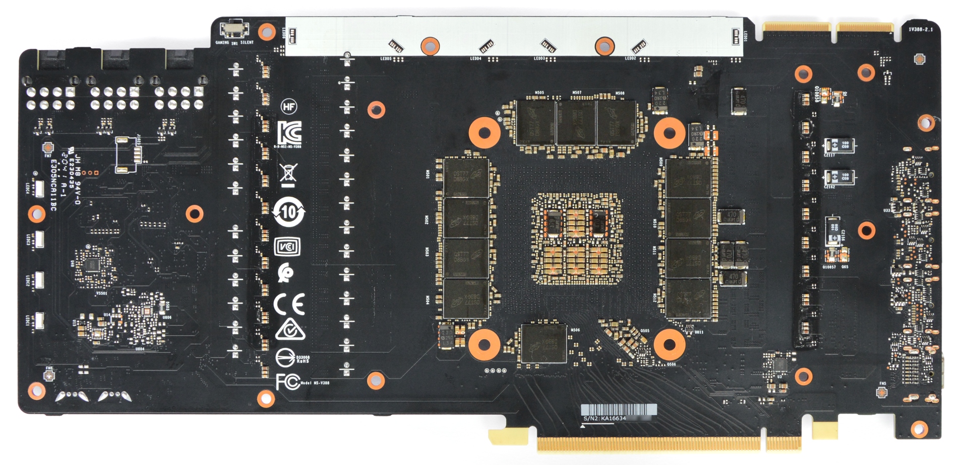 Обратная сторона платы закрыта металлической пластиной, на которой есть подсвечиваемый логотип в форме стилизованного изображения дракона. Сбоку есть разъем NVLink для совместного подключения пары устройств. В новом поколении Ampere только GeForce RTX 3090 обладает возможностью аппаратной коммутации видеокарт для совместного рендеринга.