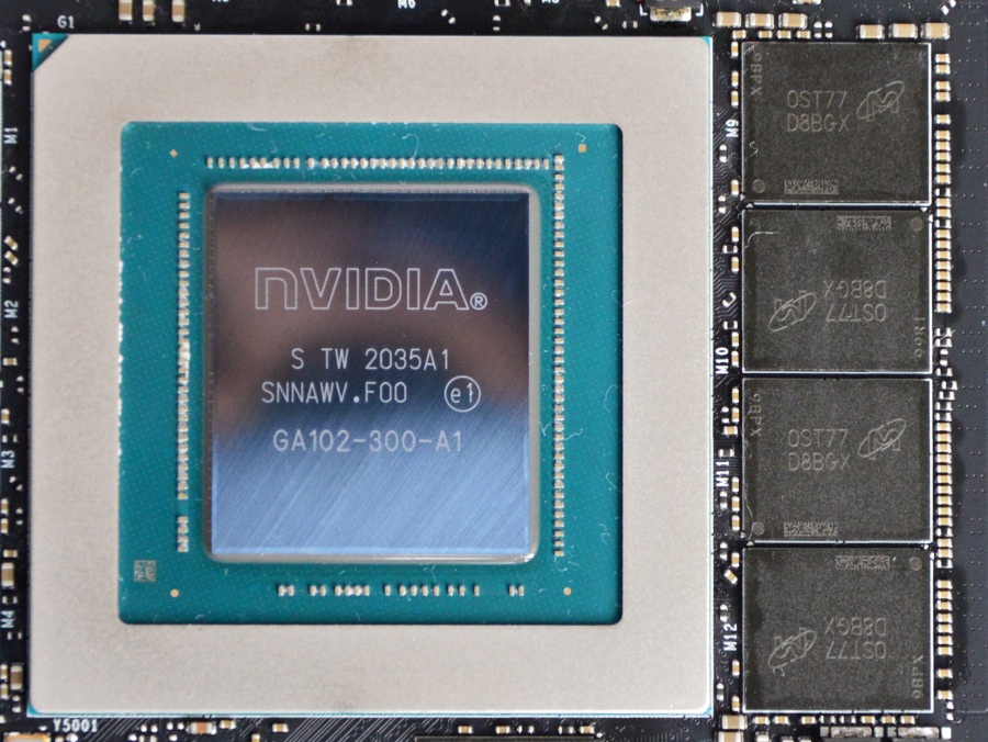 Графический процессор GA102-300-A1 оперирует 10496 потоковыми ядрами CUDA, 328 тензорными ядрами и 82 ядрами RT. На плате распаяно 24 гигабайта памяти GDDR6X от Micron с маркировкой OST77 D8BGX.