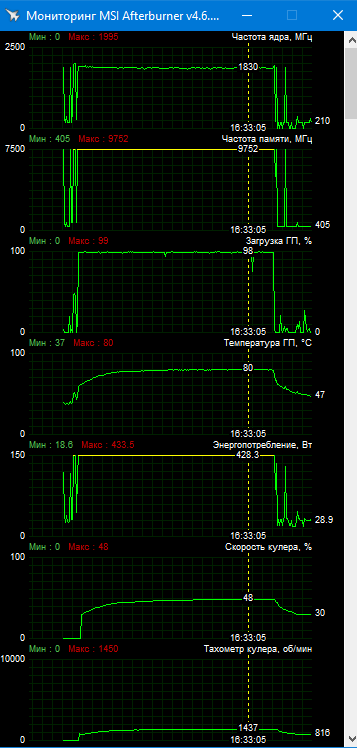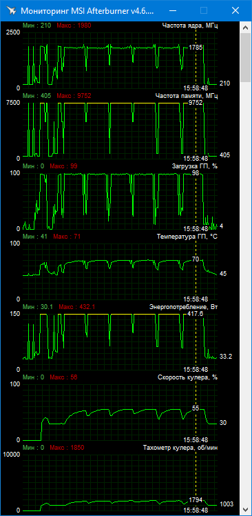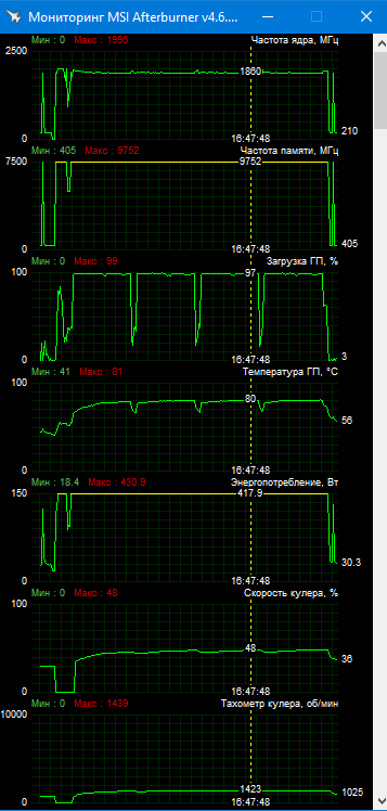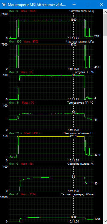 Результаты разгона отличные. Относительно начальных частот GPU был ускорен на 75 МГц, лимит мощности повышен до максимума. Итоговая частота памяти составила 20864 МГц.