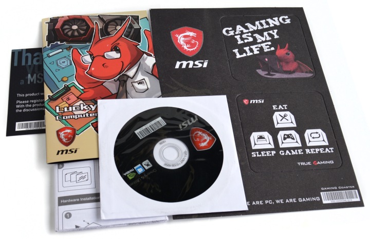 В наше время видеокарты почти не комплектуются аксессуарами. Поэтому приятно отметить, что кроме традиционного диска с программным обеспечением и инструкции внутри коробки есть набор из двух картонных подставок под чашку и даже небольшой забавный комикс.