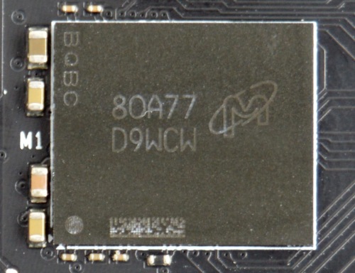 Распаяно восемь микросхем памяти Micron 8OA77 D9WCW общим объемом восемь гигабайт.