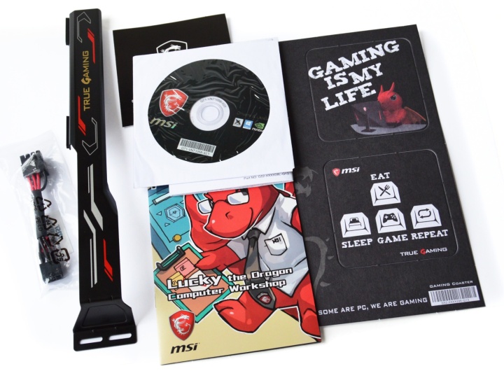 Видеокарта MSI поставляется в крупной коробке с неплохим набором аксессуаров. В комплекте кроме инструкций есть картонные подставки под чашки, металлическая поддерживающая планка для видеокарты и переходник питания с 6-контактного на 8-контактный разъем.