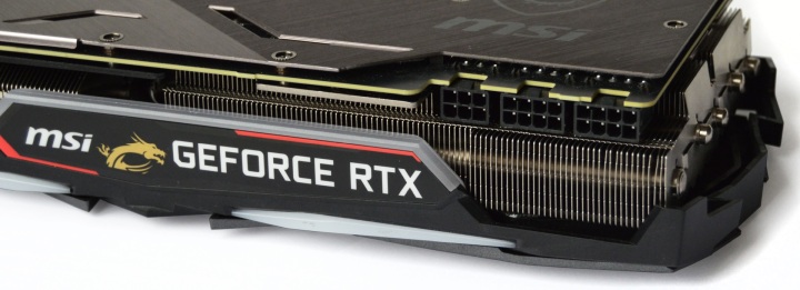 В дополнение к двум привычным разъемам питания на восемь контактов у MSI Gaming есть третий 6-контактный разъем. На боковой грани присутствует подсвечиваемая площадка с логотипами.