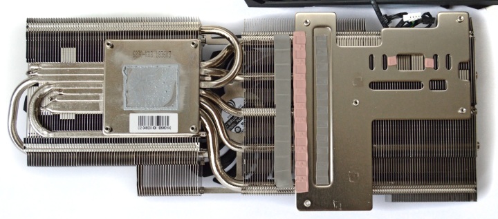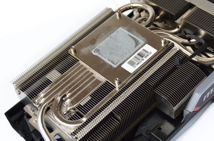 Пора заглянуть под «капот» видеокарты MSI. Система охлаждения состоит из большого двухсекционного радиатора с множеством тепловых трубок. Это продуманная в мелочах конструкция.