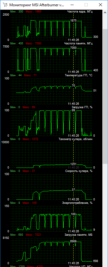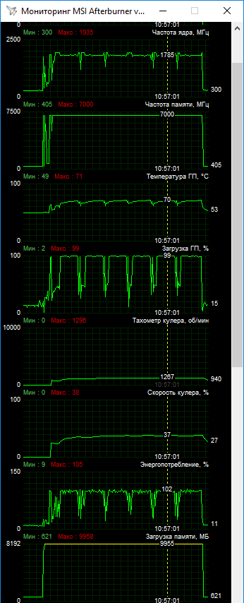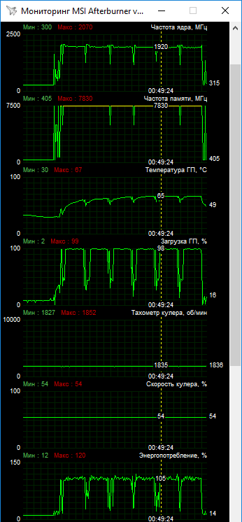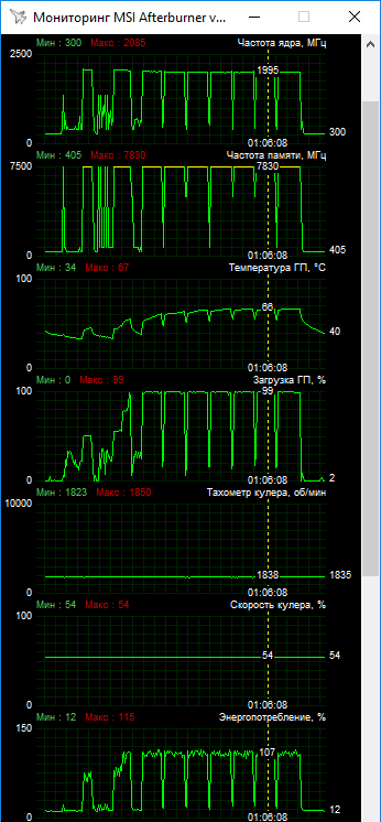 В ряде игр частоты ядра держались около 2000 МГц при пиковых значениях до 2085 МГц. В тяжелом тесте The Division 2 частоты проседали до 1920–1935 МГц. В данной конфигурации частот видеокарта стабильно работала при фиксации вентиляторов на уровне 1800 об/мин.