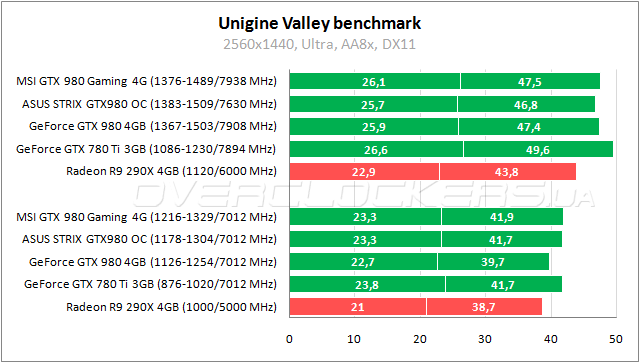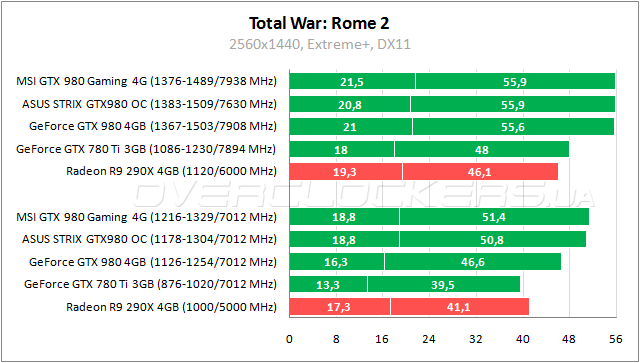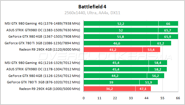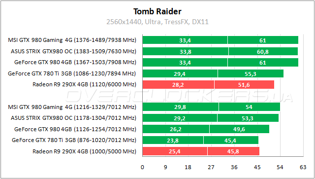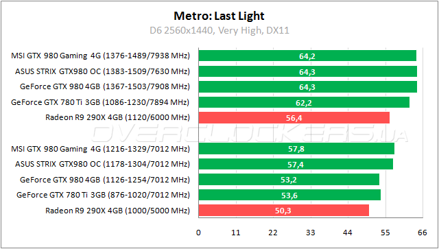 MSI лидирует в номинале и при разгоне. ASUS по-прежнему дышит в спину. Стандартная версия GeForce GTX 980 с плавающей частотой Boost уступает 10–15%. У Radeon небольшое отставание по минимальному fps и внушительная разница с лидерами по среднеигровой частоте кадров.