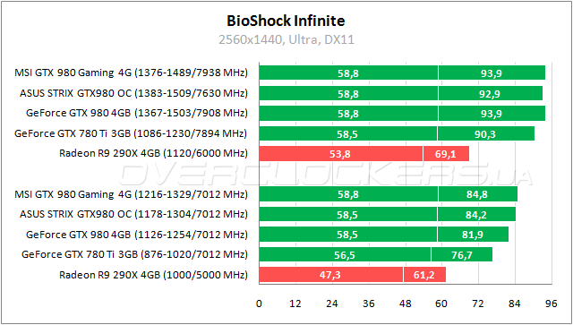 В BioShock Infinite нерефренесные версии GeForce GTX 980 от MSI и ASUS вновь наравне. Radeon R9 290X в роли аутсайдера.