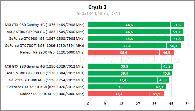 Крошечный перевес над ASUS и разница с референсом 5–6% в Crysis 3. Radeon слабее на 12–19%. Разгон ускоряет MSI на 12–13%.