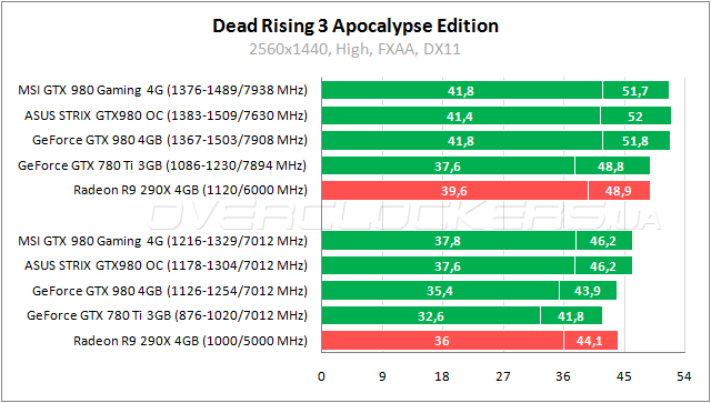В Dead Rising 3 преимущество над референсом 5–6%, выигрыш относительно конкурента AMD на уровне 5%. Прирост от разгона 12%.