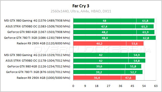 В Far Cry 3 герой обзора быстрее референса на 6% и на 15% производительнее Radeon R9 290X. Разгон дает дополнительное ускорение в 13%.