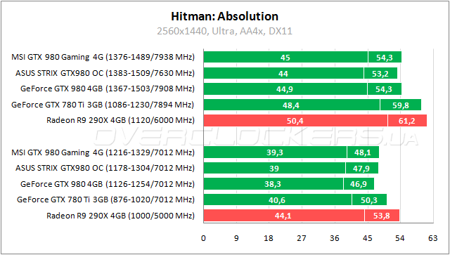 В Hitman заводской разгон ядра без увеличения частоты памяти дает весьма скромное преимущество над обычной версией GeForce GTX 980. До старого GeForce GTX 780 Ti герой обзора не дотягивает 3–4%. В номинале лидирует Radeon, но с разгоном MSI выдает и более высокие показатели.