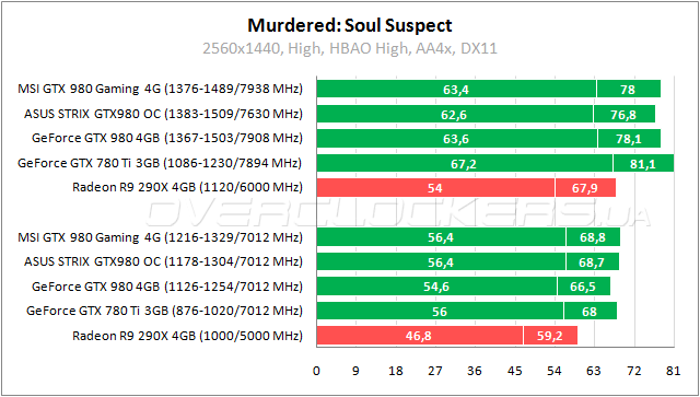 Gaming лидирует в Murdered с мизерным перевесом над ASUS и GeForce GTX 780 Ti. При разгоне старый флагман немного быстрее. Конкурент от AMD на привычном последнем месте.