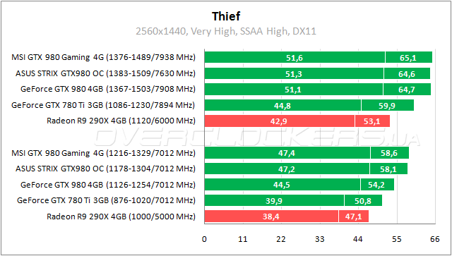 Более заметный перевес над ASUS в Thief, хотя тоже меньше 1%. Разница с референсом до 8%, преимущество над Radeon на уровне 24%.