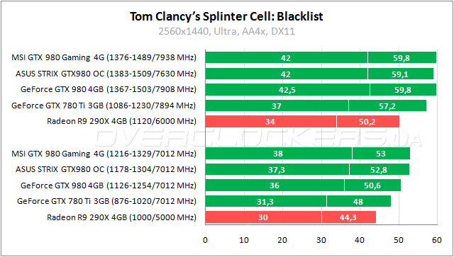 В Splinter Cell по-прежнему лидирует MSI Gaming. Внушительный отрыв от Radeon R9 290X на уровне 20–27%. Разгон придает ускорение в 11–13%.