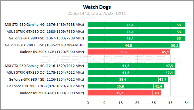 Идентичные результаты у MSI и ASUS в Watch Dogs. Radeon R9 290X в традиционной роли аутсайдера, герою обзора он уступает 18–19%.