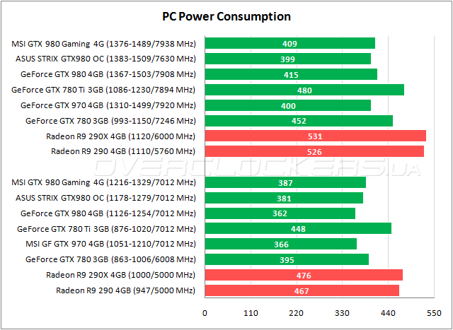 MSI потребляет больше ASUS, но все еще меньше GeForce GTX 780. Только при разгоне MSI превышает показатели этого старичка.